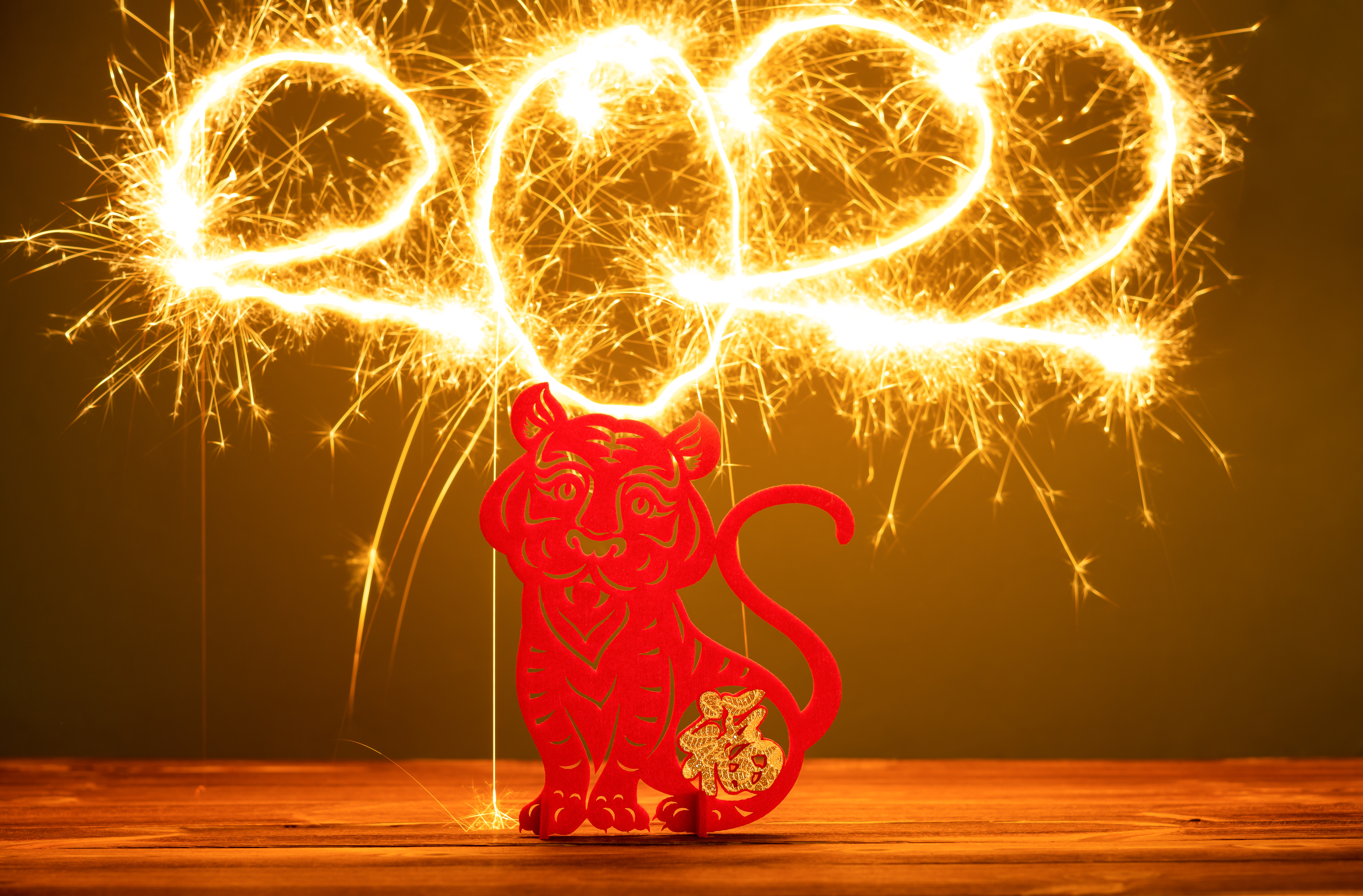Chinese New Year of tiger 2022 mascot paper cut with 2022 writte