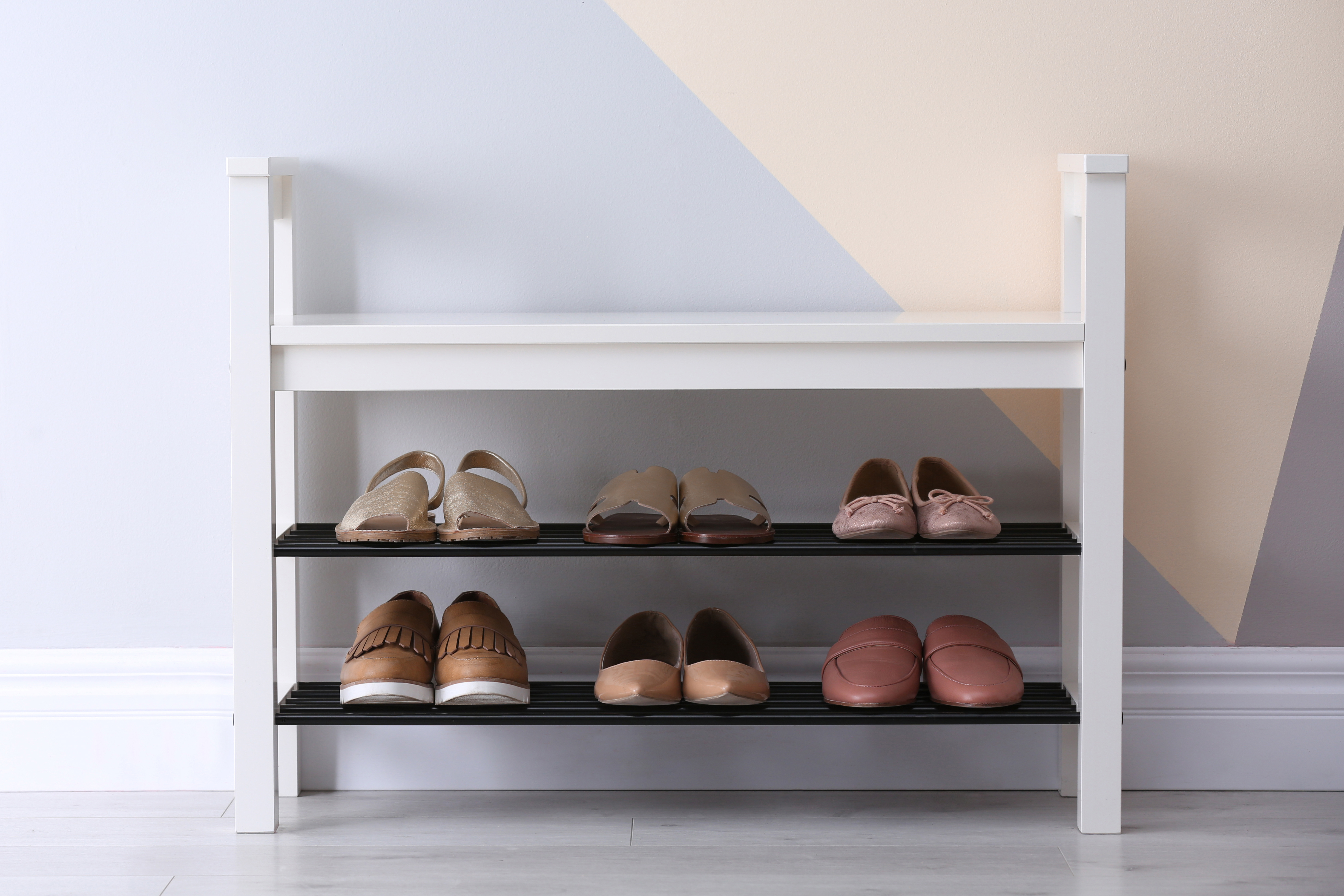 Shoe rack with different footwear near color wall, space for tex
