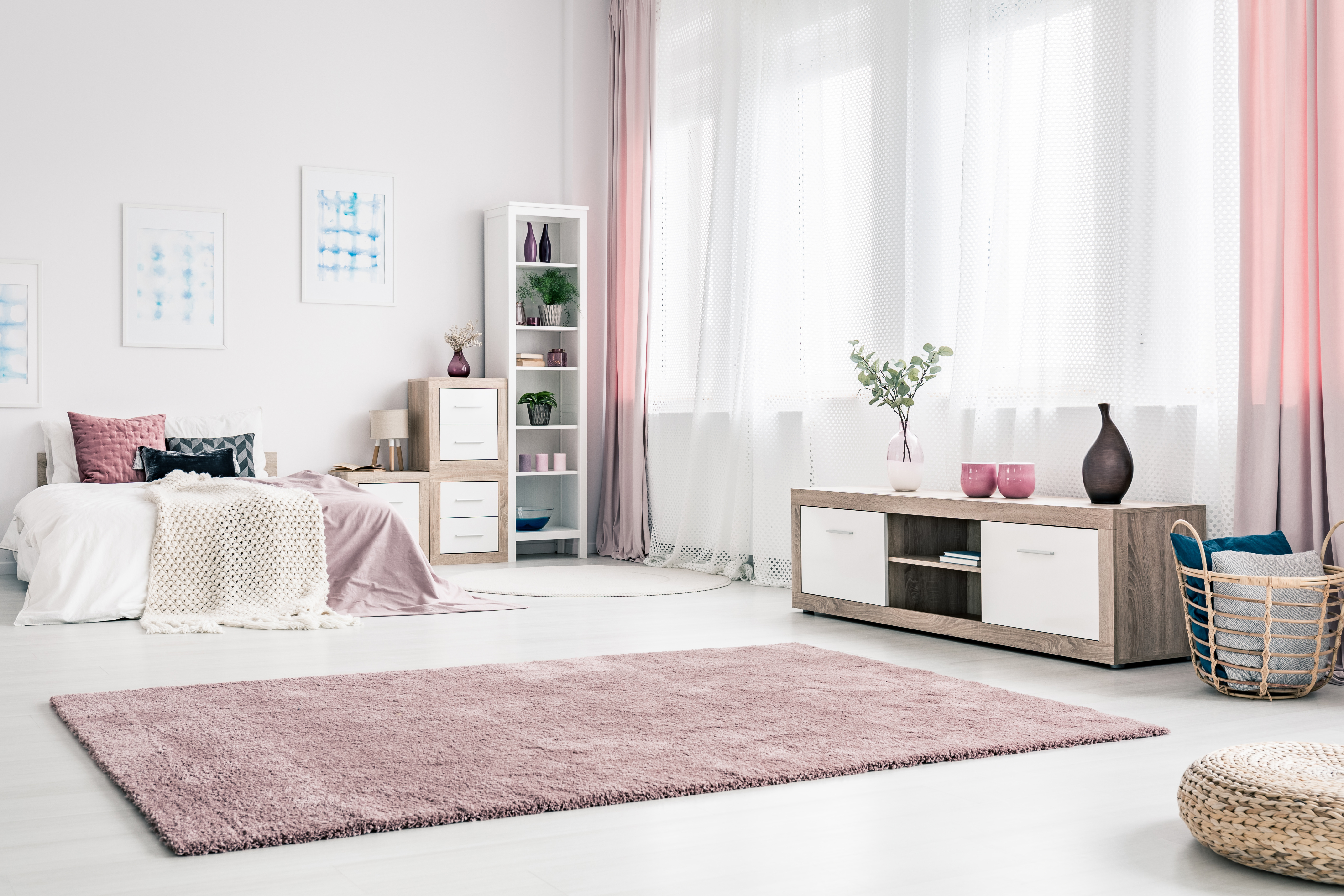 Big fluffy rug on white wall of classy bedroom interior with woo
